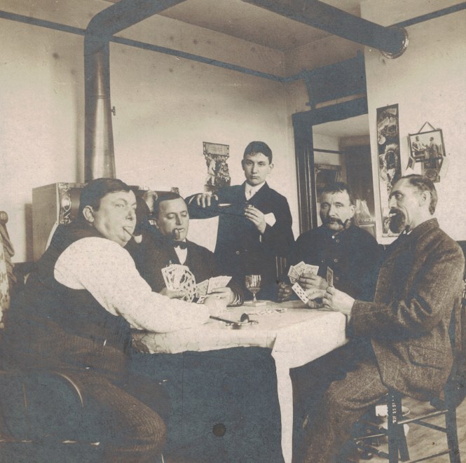 The following picture was also found in Aunt Ann’s estate, unfortunately, this is one of the few that she did not write any names on.  The guy scratching his head, second from left resembles other pictures I have of John Steffel, her husband.  And, the portly guy on the far left could be her Father, my Gr-Grandpa Rauch; although he usually had a mustache. If either of those are right, then it would explain why Aunt Ann kept the picture.  Whoever they are, the smoking, drinking, and card playing look exactly as I would have imagined a Wednesday night meeting of the High Ups Sheepshead Club in old  Milwaukee.